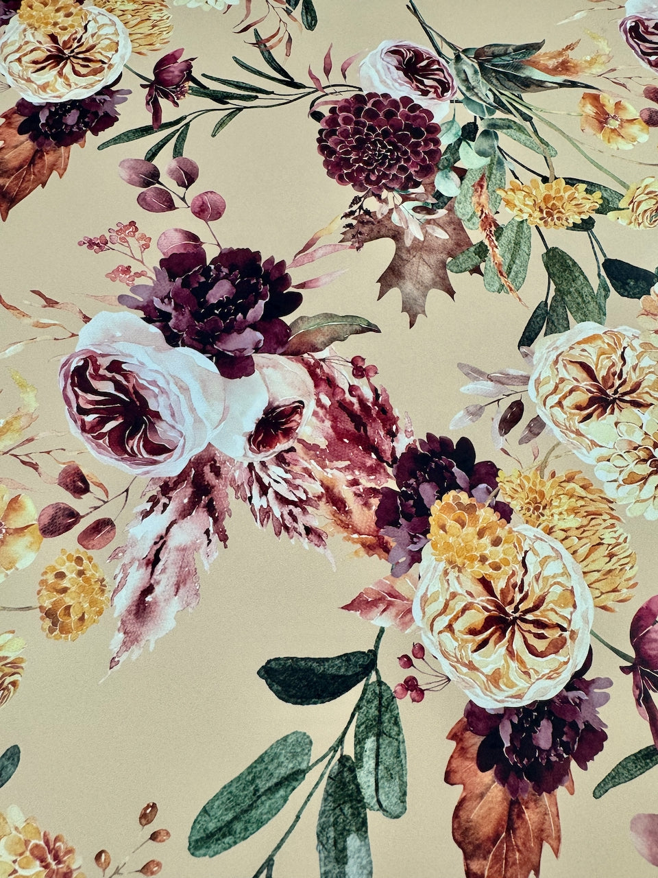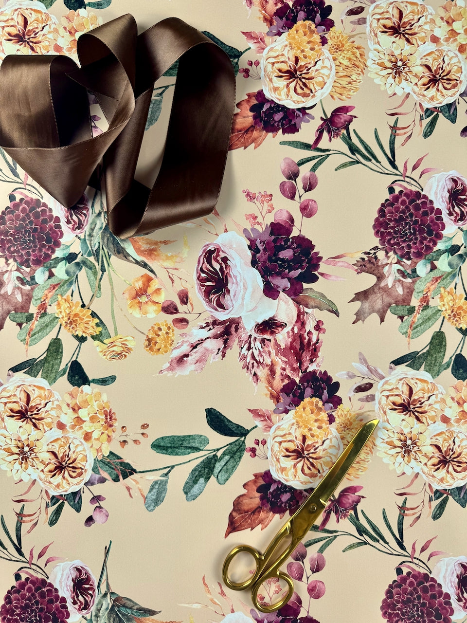 Autumn Bouquet design brings the richness of fall to life with lush blooms, earthy foliage, and deep, jewel-toned accents set against a warm, neutral backdrop. Perfect for peel-and-stick wallpaper, premium wrapping paper, or refined seasonal décor, this timeless pattern adds depth, warmth, and sophistication to any space. A standout piece in the Autumn Estate Collection, it captures the beauty and abundance of the harvest season.