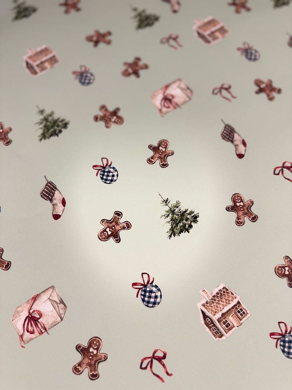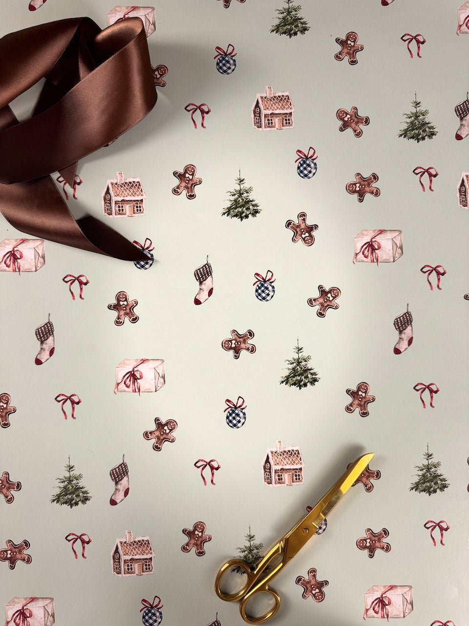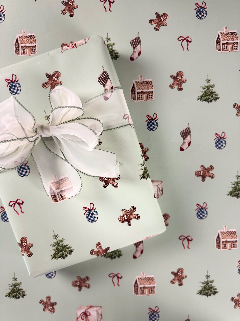 A sweet and nostalgic print inspired by Jess’s dear friend Becca and her love for gingerbread. This design brings together all the cozy holiday elements — gingerbread cookies, frosted houses, stockings, bows, and twinkling evergreens. Perfect for wrapping up warm memories (and treats!) all season long.