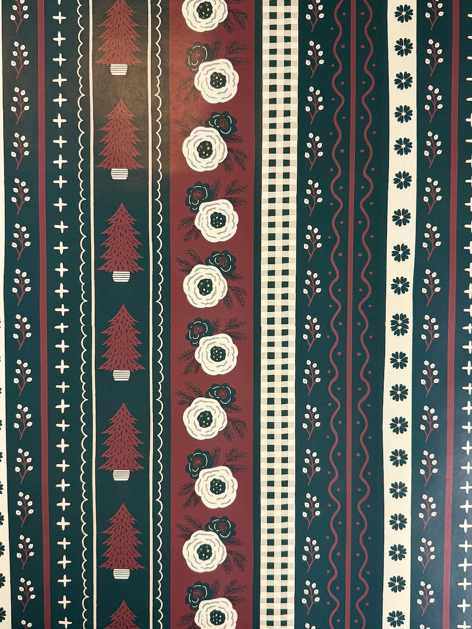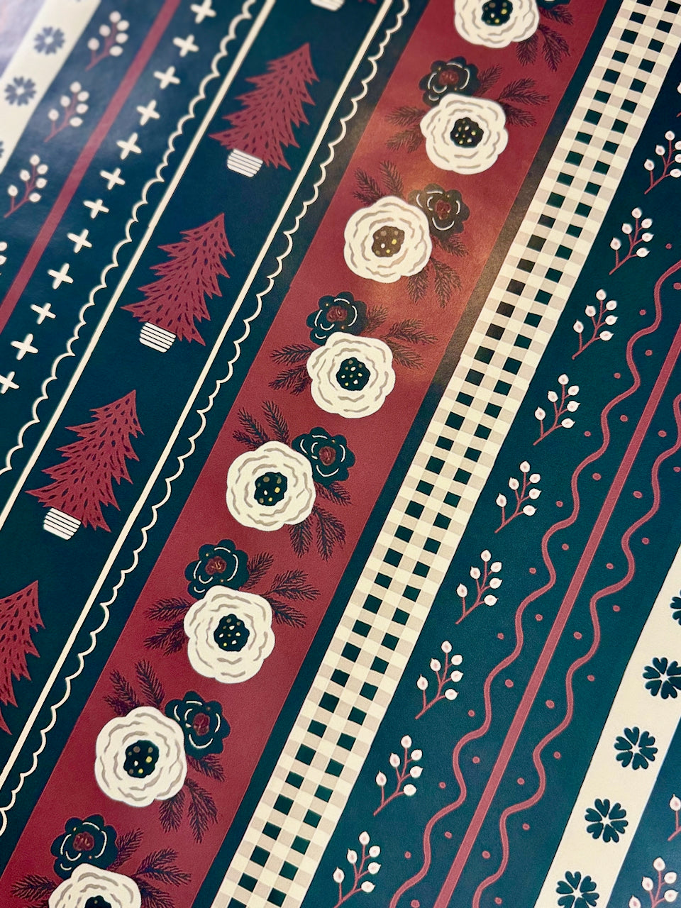 Inspired by the warmth and nostalgia of a countryside holiday, Cabin Christmas brings Ralph Lauren’s signature elegance to your gift wrapping. Deep forest green and burgundy stripes are accented with hand-drawn trees, winter florals, gingham, and delicate decorative borders — creating a layered, storybook pattern that feels timeless yet inviting.