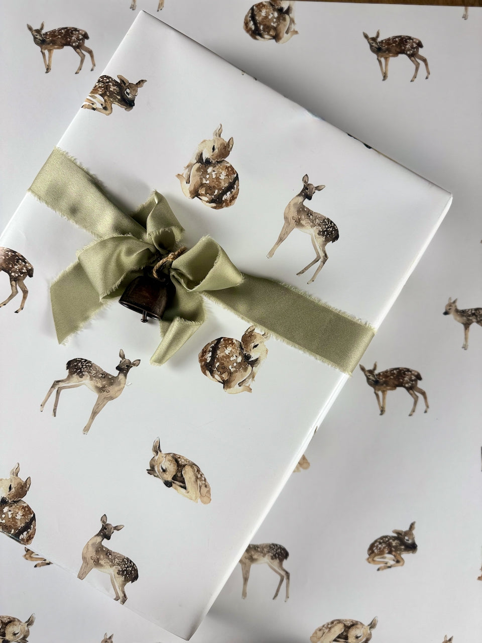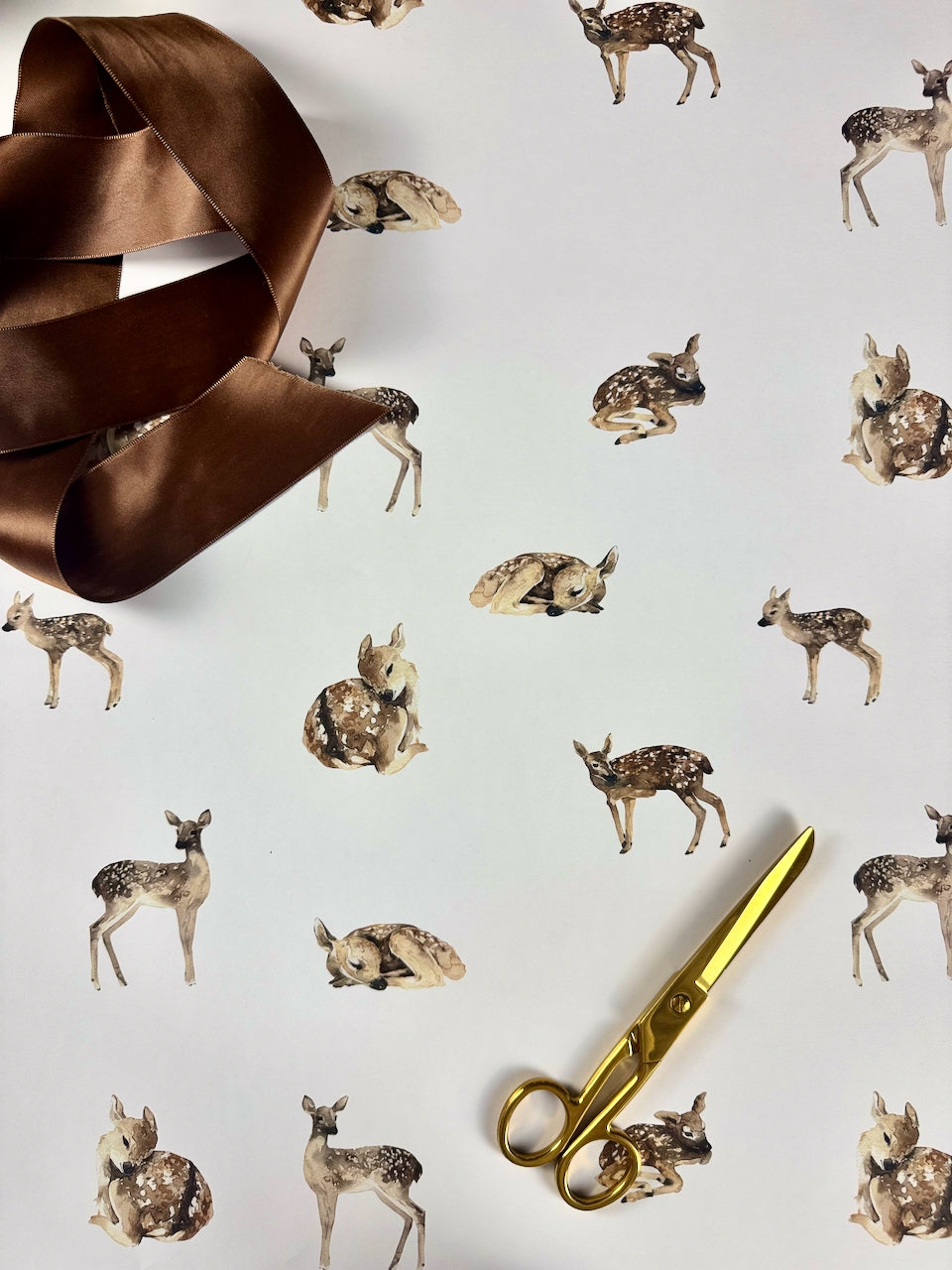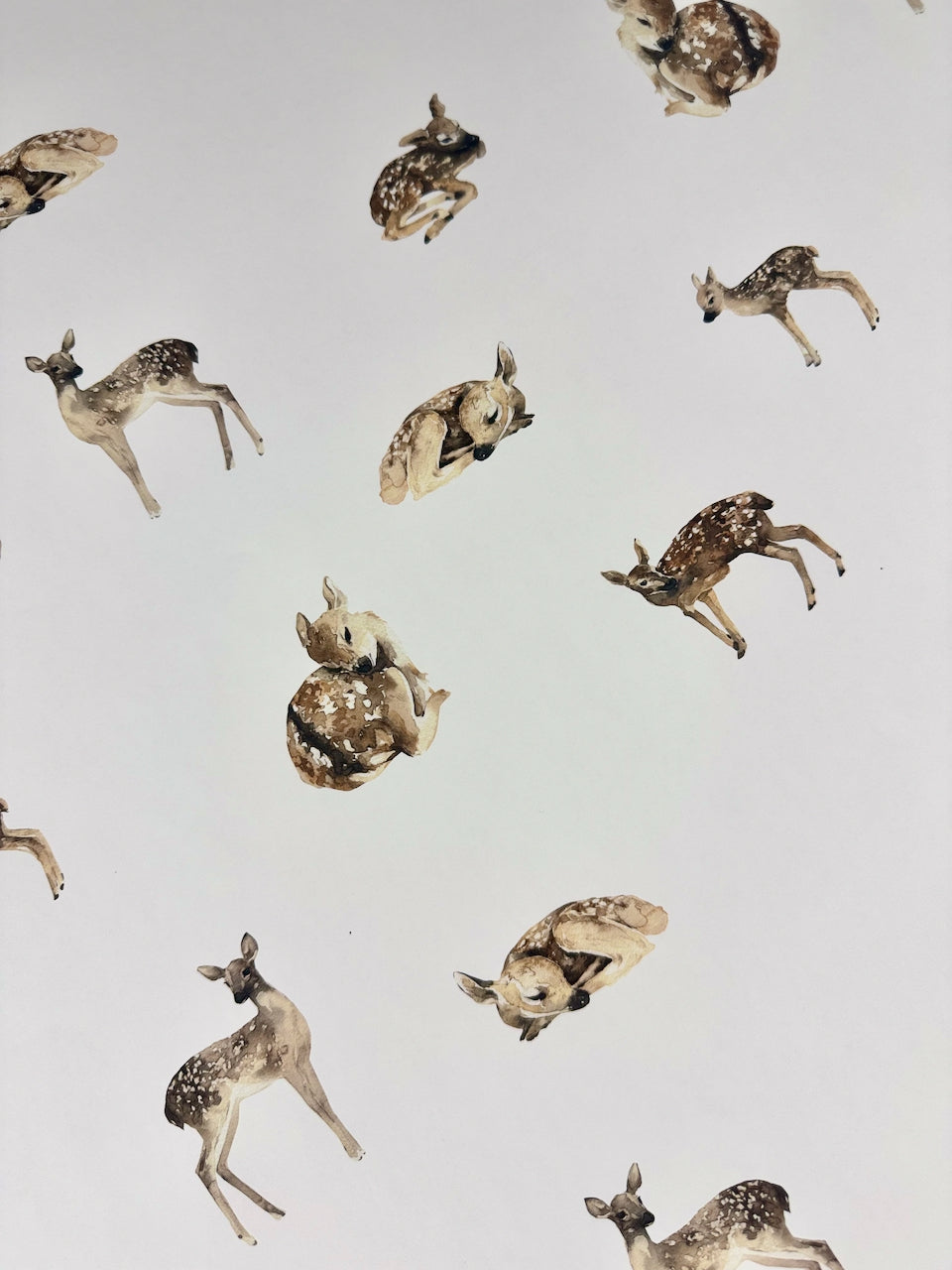 Like the quiet stillness of a forest blanketed in snow, Hushed Haven captures the magic of winter’s most peaceful moments. Soft, hand-painted deer are delicately scattered across a clean, airy background, creating a design that feels refined and understated.