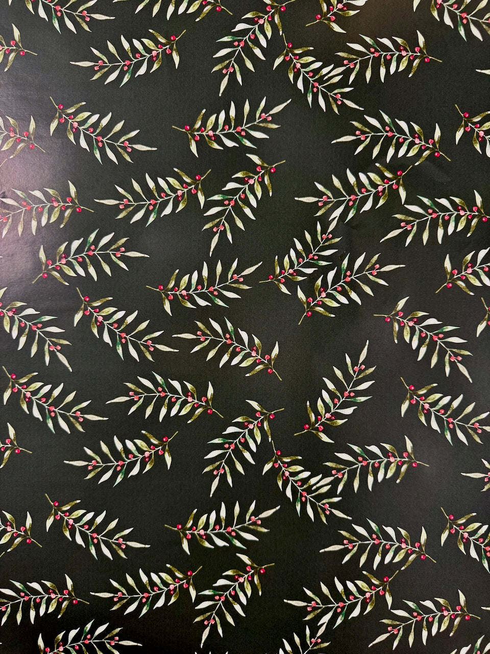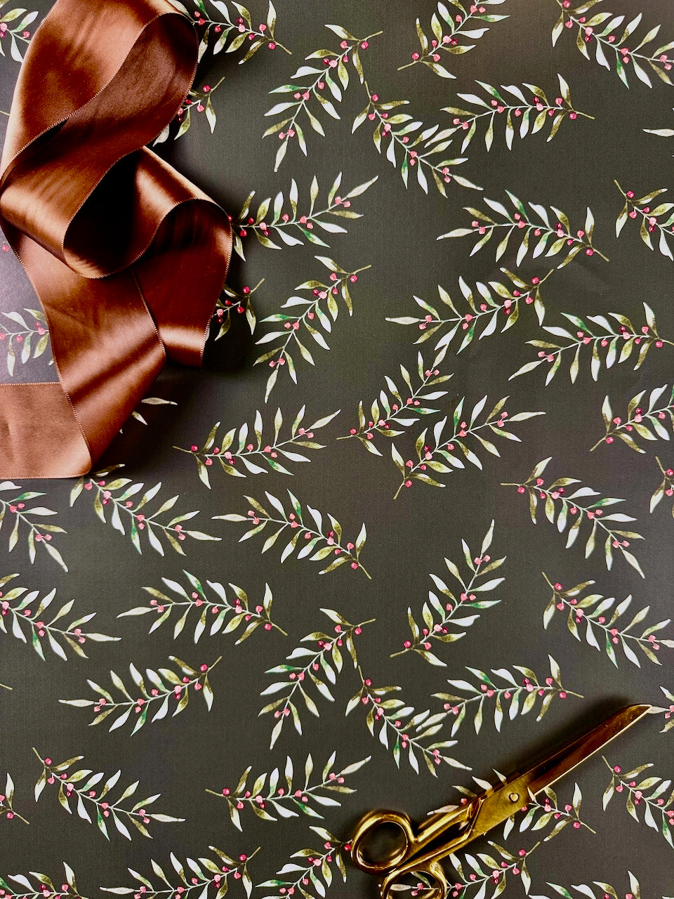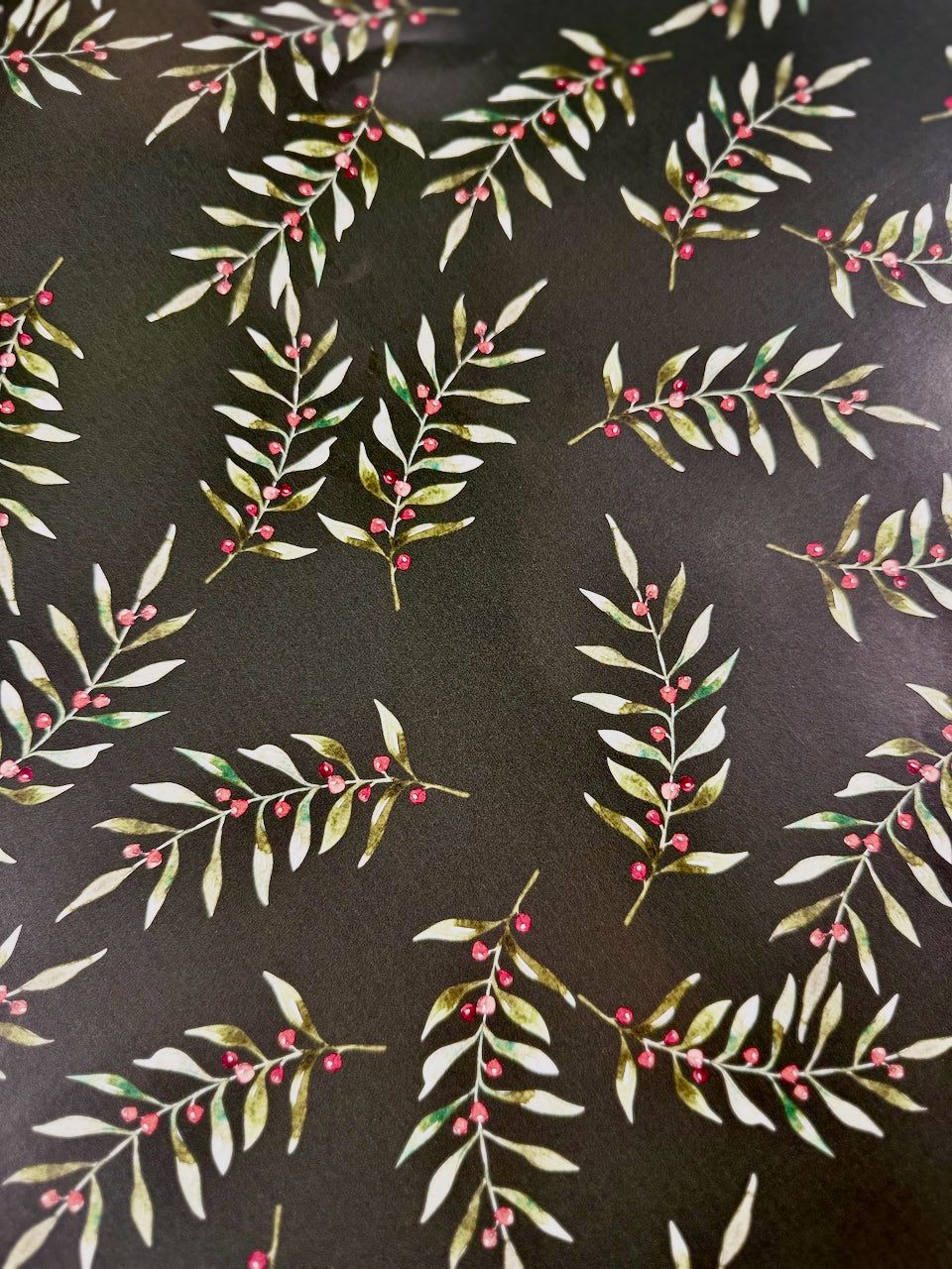 A timeless holiday botanical. Olive & Berry features hand-painted greenery and delicate pops of festive red, bringing a romantic, nature-inspired twist to your holiday wrapping and styling.