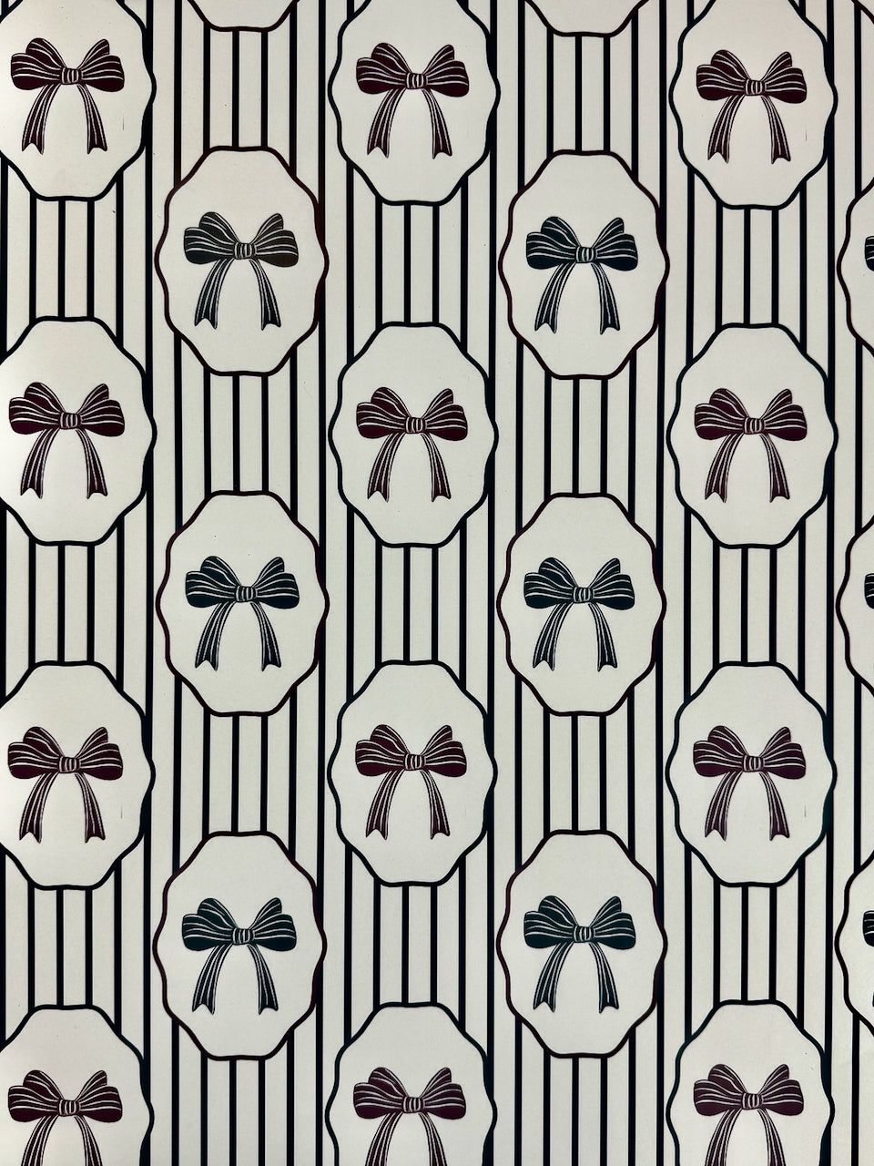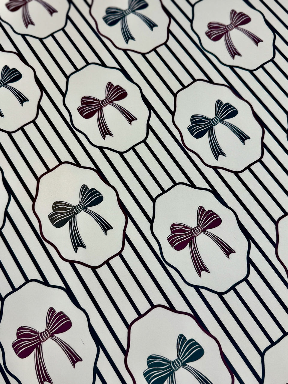 Classic, refined, and effortlessly chic — the Bow on Top Wrapping Paper is a modern take on traditional luxury. Inspired by Ralph Lauren’s signature aesthetic, this design features satin bows framed in soft scalloped borders, set against vertical navy and burgundy stripes. The look is timeless and tailored, evoking the elegance of vintage fashion and stately interiors.