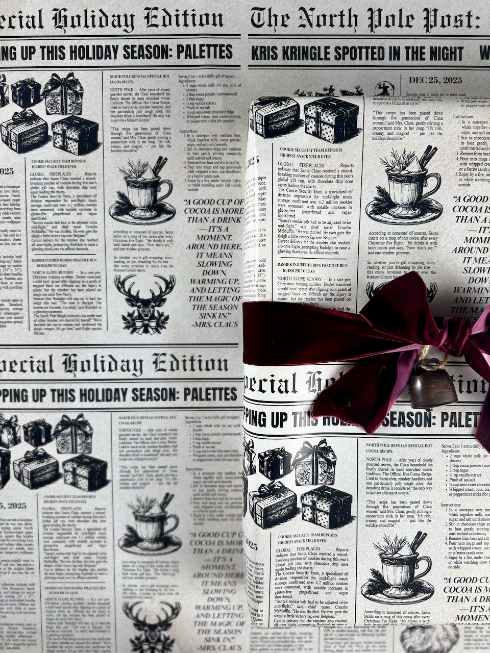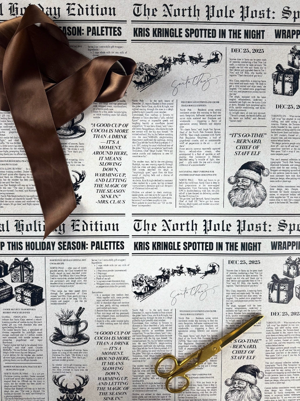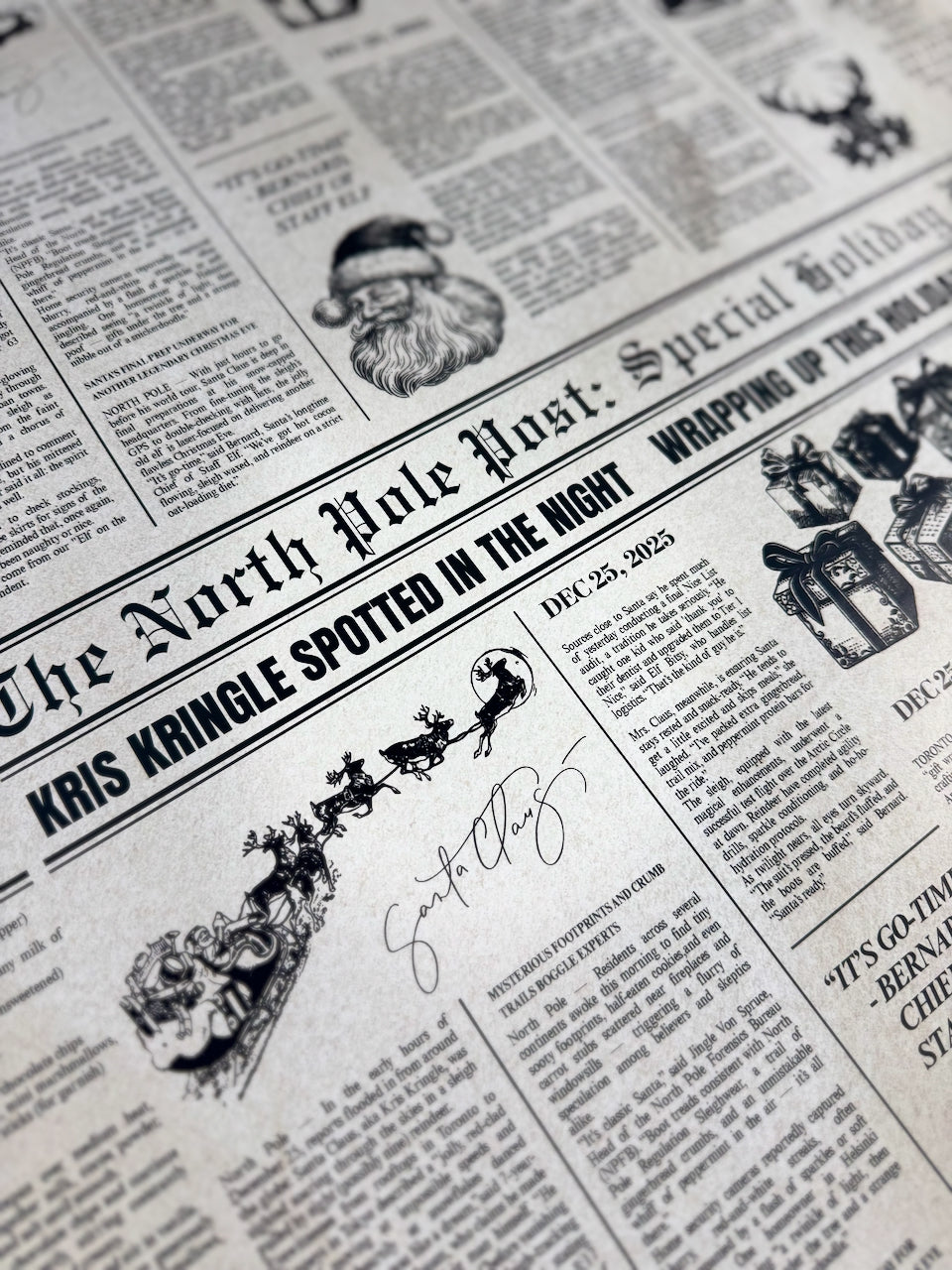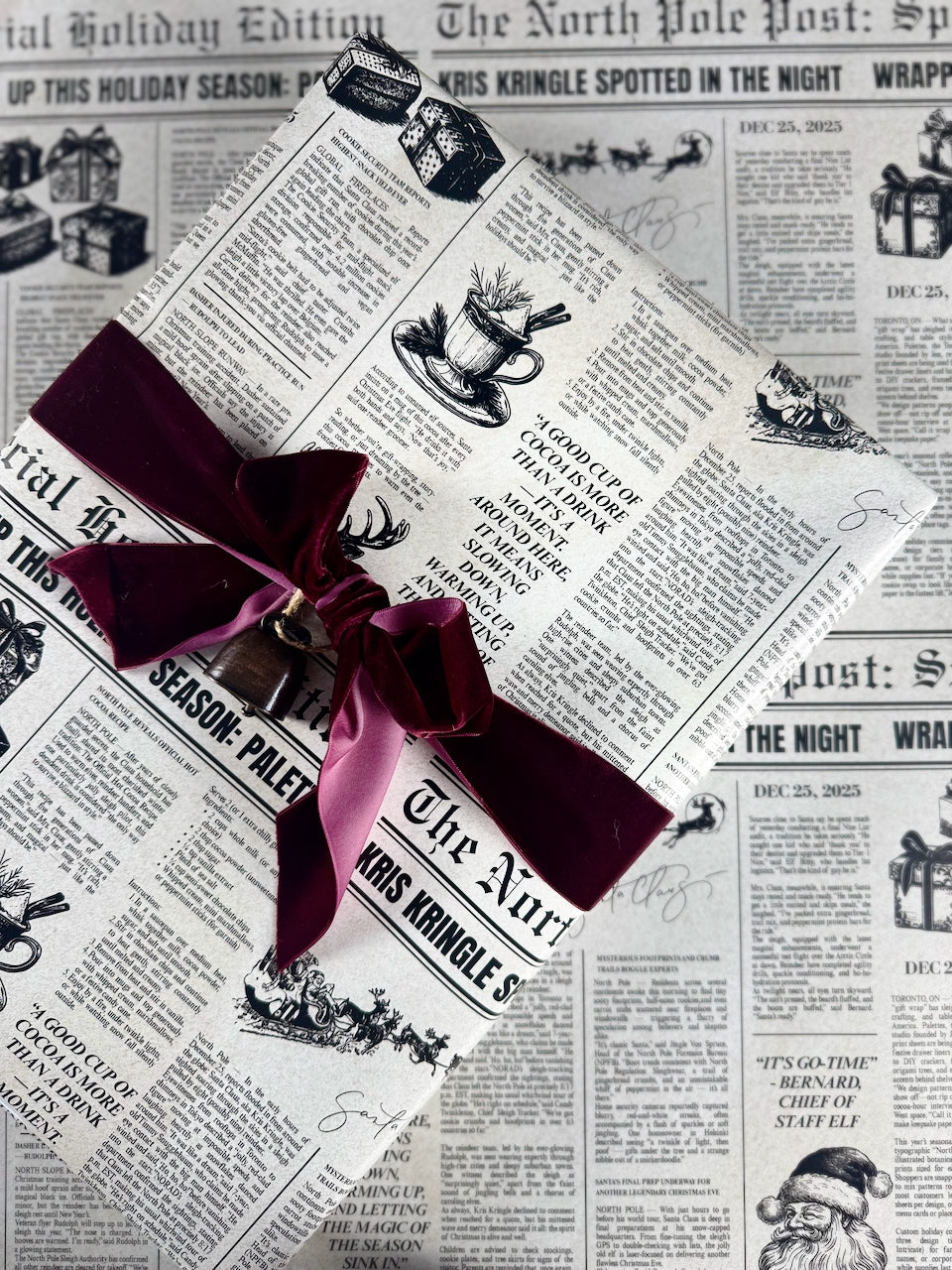 North Pole Post brings nostalgic holiday magic to life with a vintage newspaper design straight from Santa’s press. Featuring playful headlines, classic illustrations, and a timeless neutral palette, it’s the perfect way to wrap gifts that feel as special as the season itself. Pair with velvet ribbons or twine for a truly unforgettable presentation.