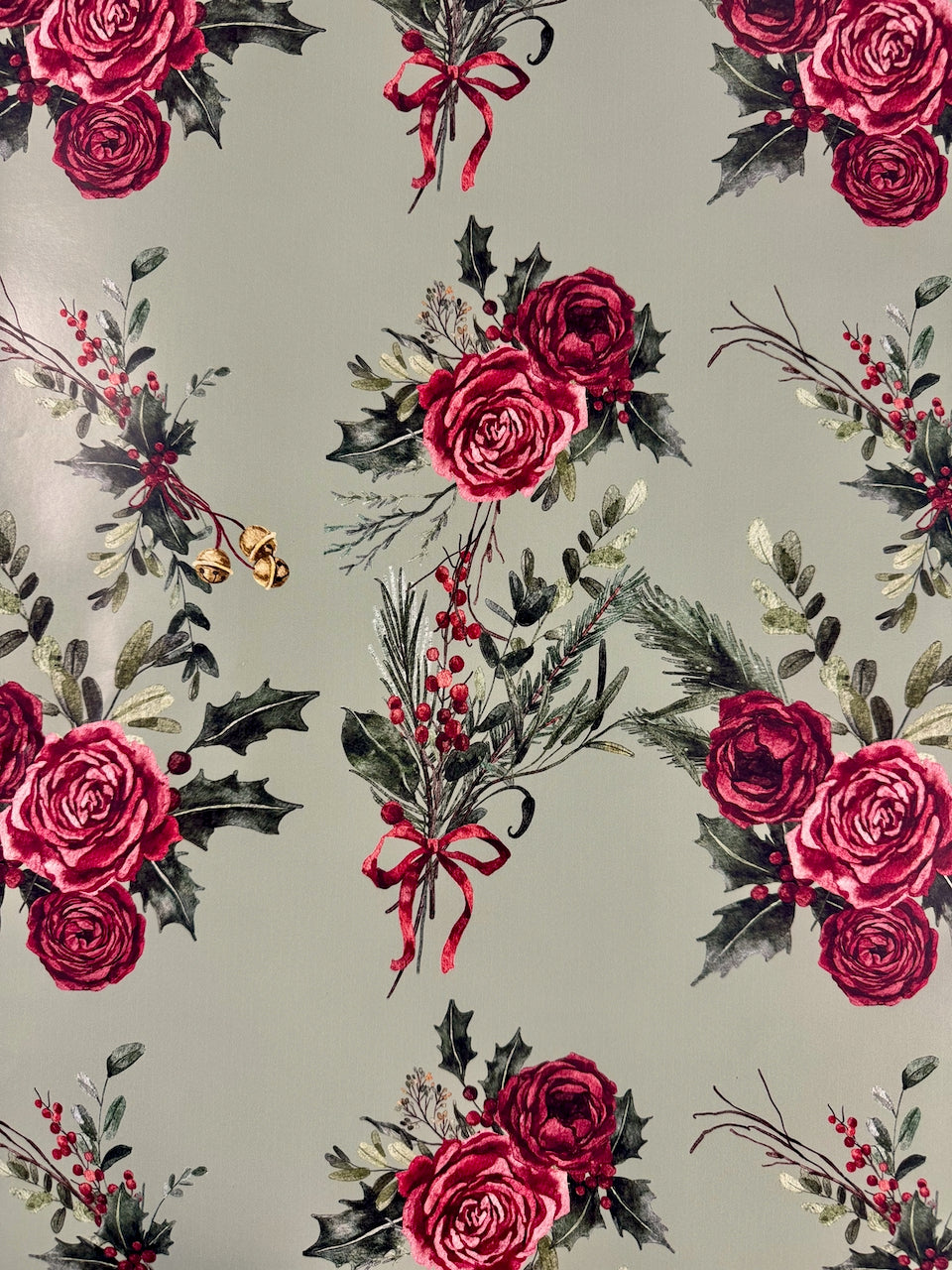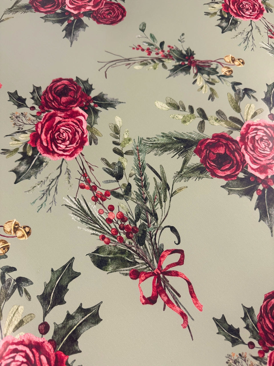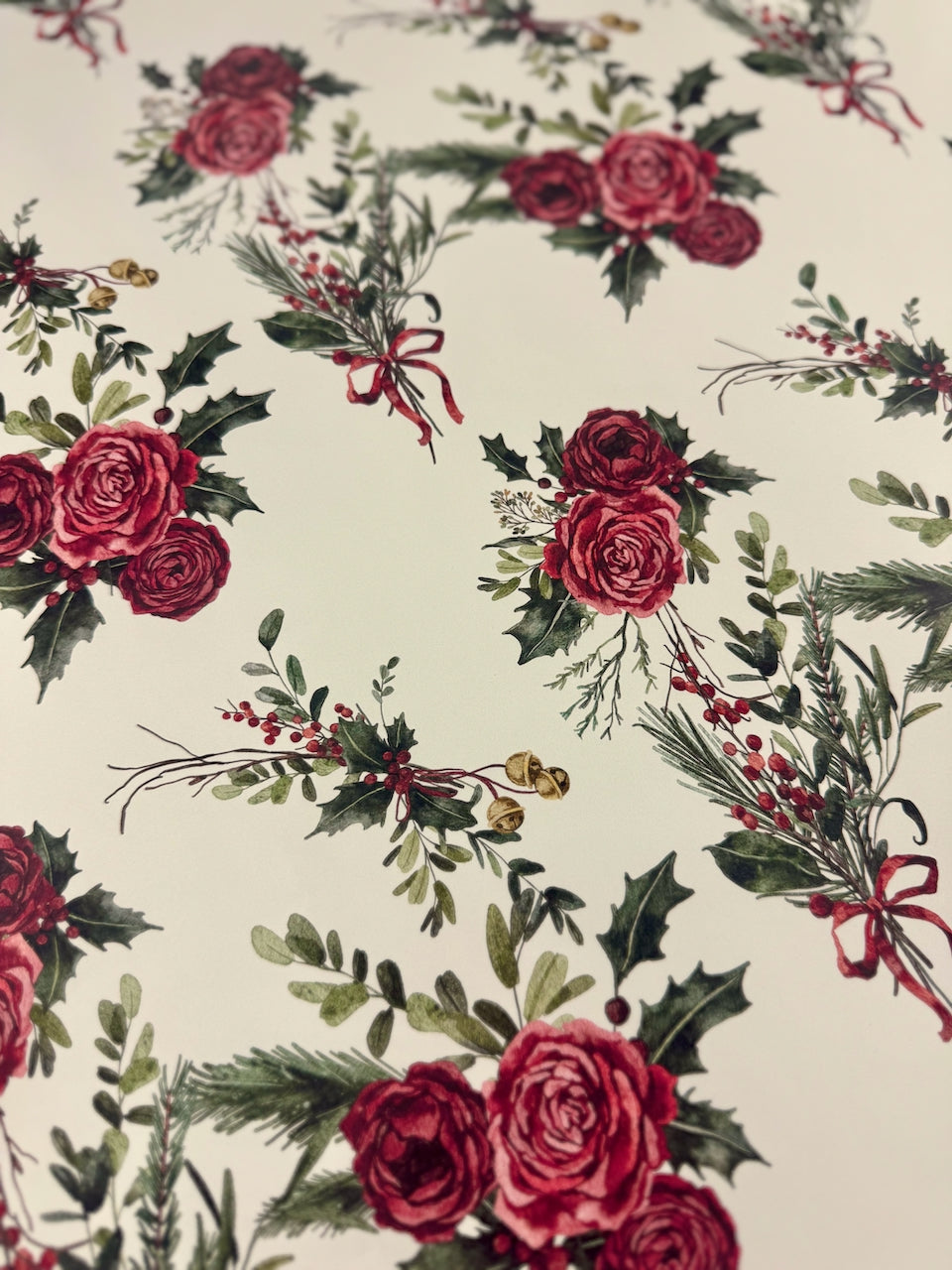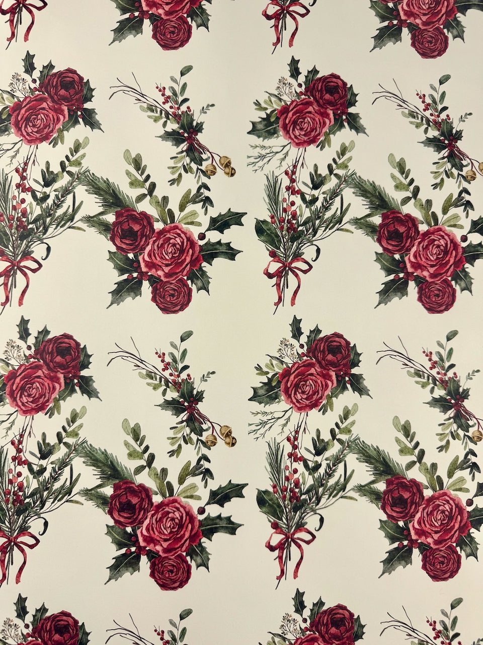 A love letter to the holiday season. Tidings features lush red roses, sprigs of holly, and festive greenery tied with ribbons and tiny golden bells. Romantic and timeless, this design brings the magic of holiday tradition to life.