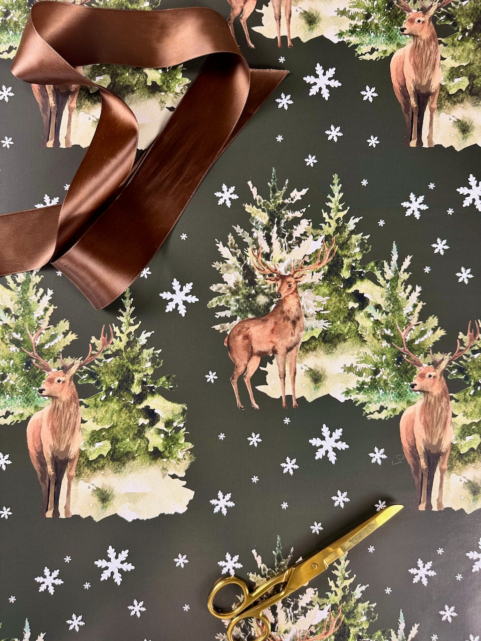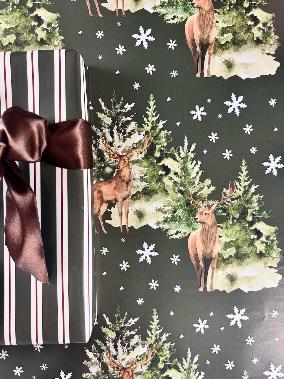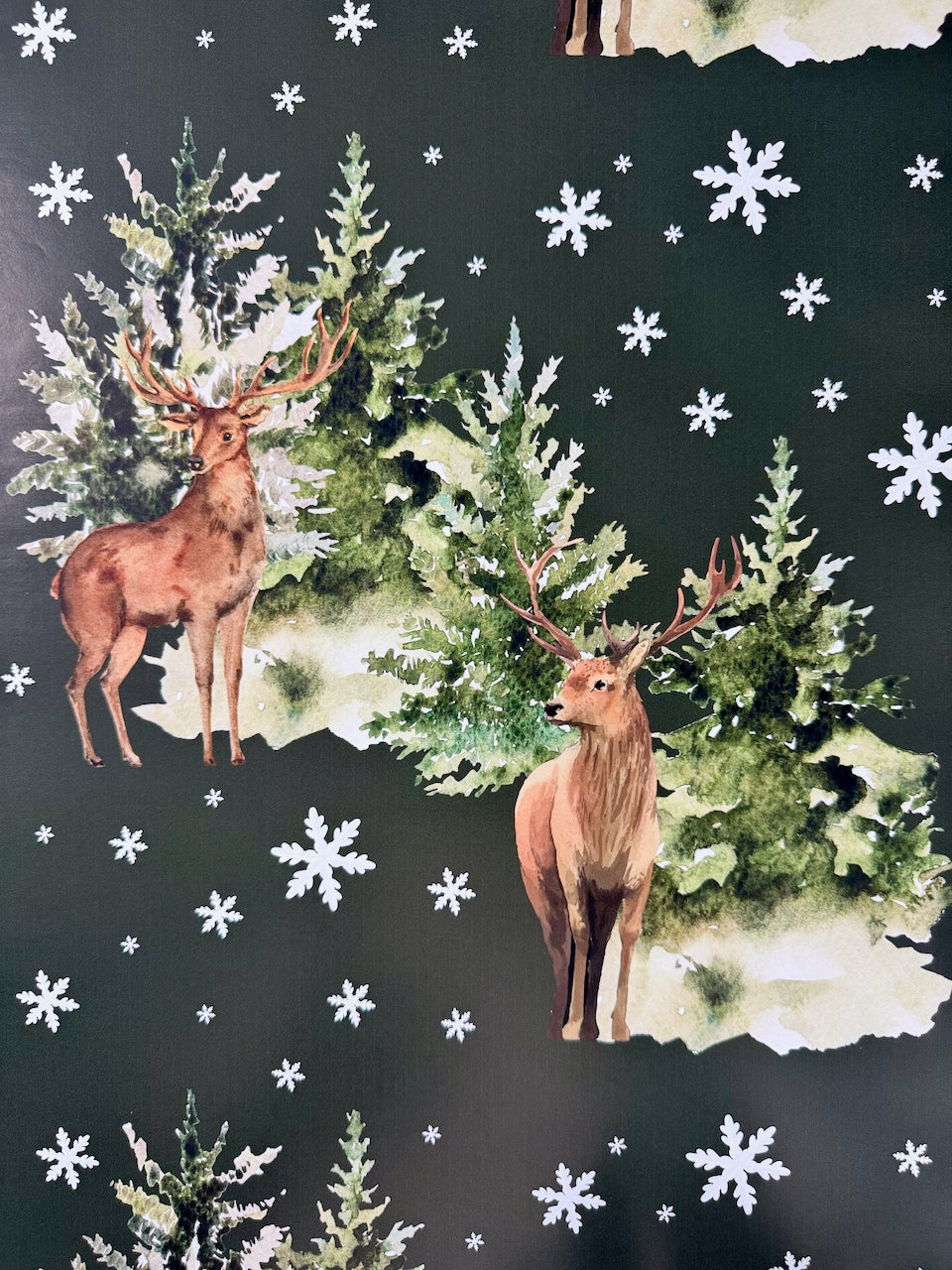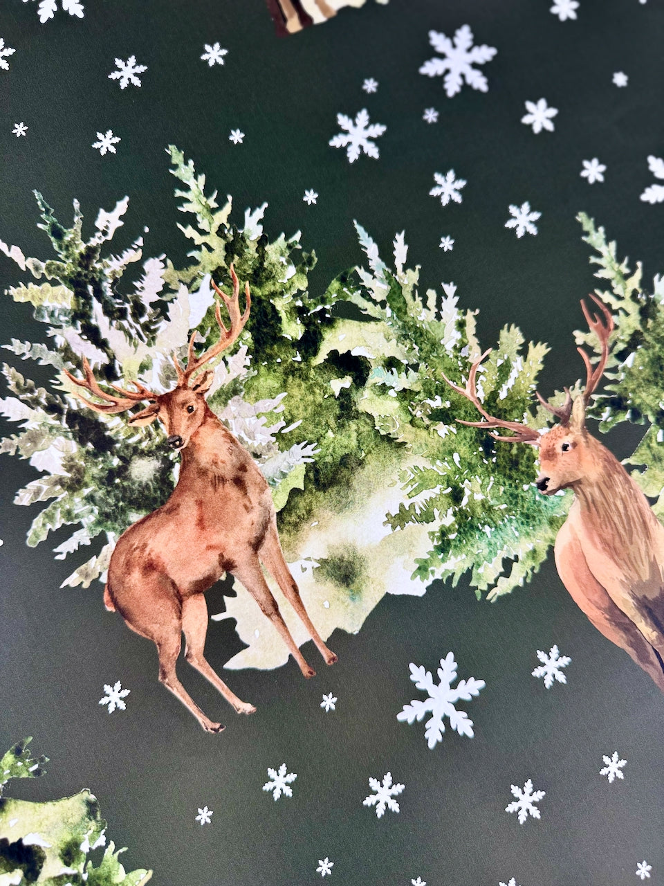 A design that feels like stepping into a storybook Christmas. Winter Lodge blends heritage-inspired charm with cozy holiday warmth — regal stags stand among snow-covered pines, framed by drifting snowflakes on a deep green backdrop. It’s the perfect balance of rustic cabin elegance and timeless holiday tradition, making every gift feel like it belongs under a classic Christmas tree.