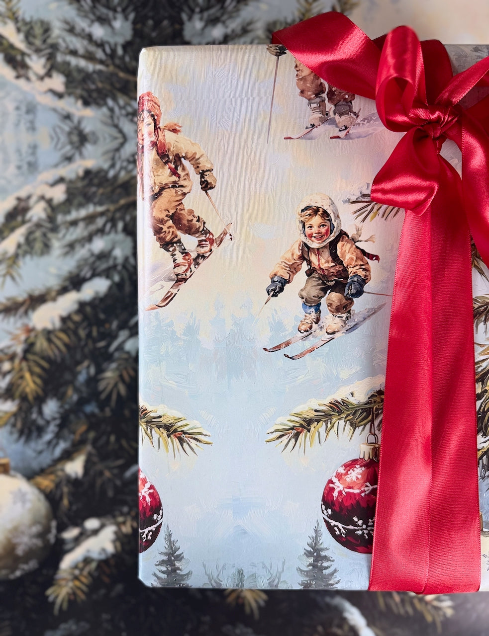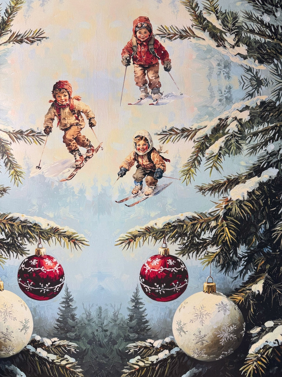 A celebration of childhood wonder. Winter’s Joy captures the timeless magic of snowy days — children skiing and sledding beneath snow-laden branches adorned with shimmering ornaments.