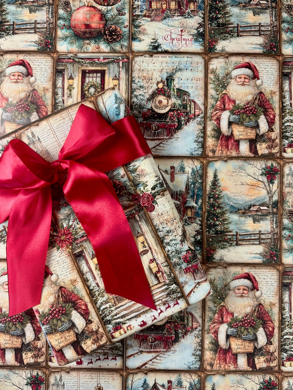 Step back in time with Yuletide Village, a pattern filled with nostalgic holiday charm. Featuring Santa Claus, vintage ornaments, cozy cottages, and snowy trains, this design captures the magic of Christmas past. Perfect for adding a timeless, storybook feel to your wrapping or décor.